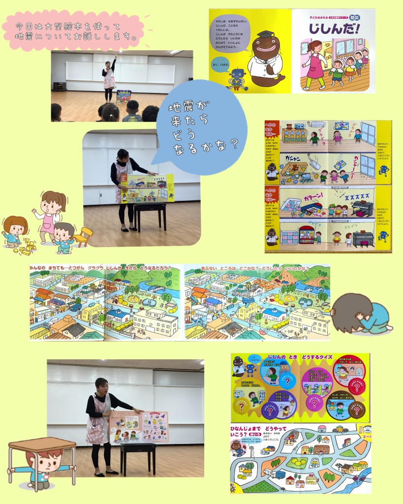 大型絵本を使い、地震が起こると、家の中はどうなるのか、外はどうなるのか