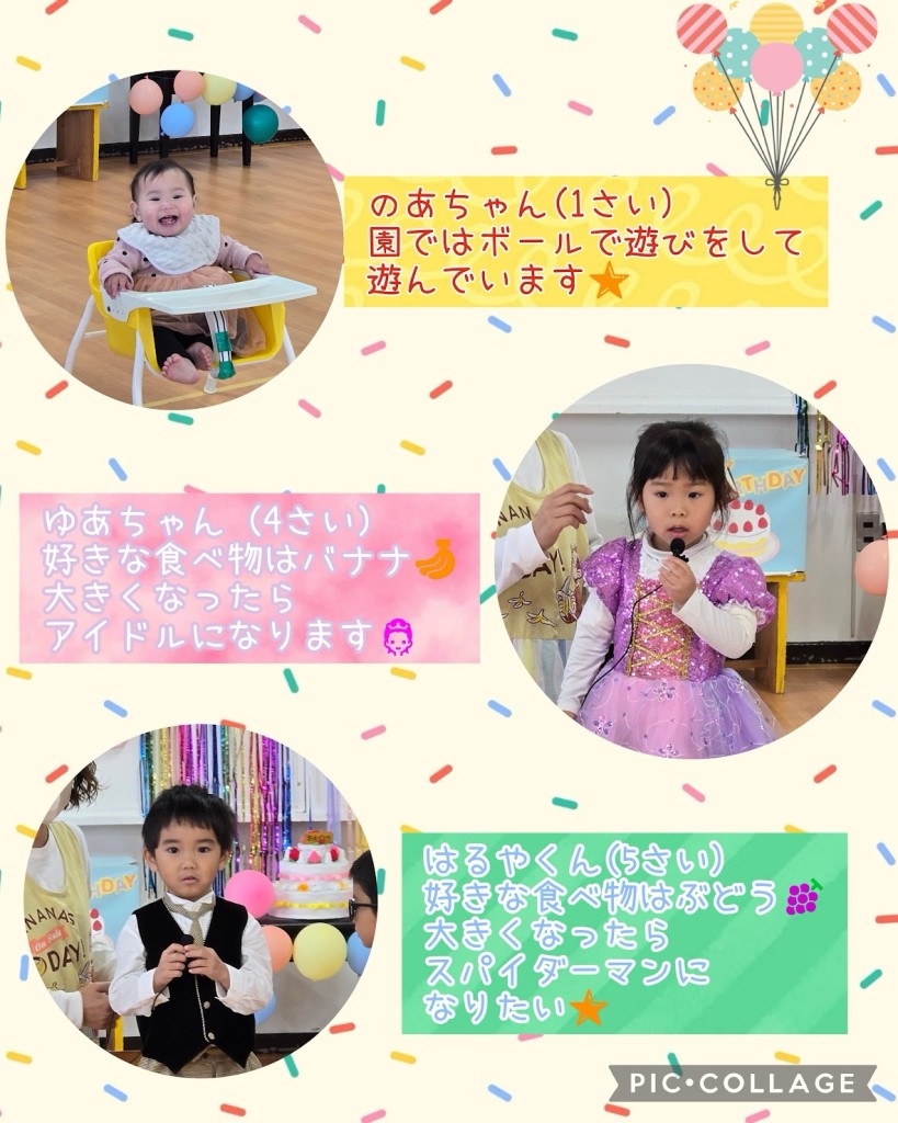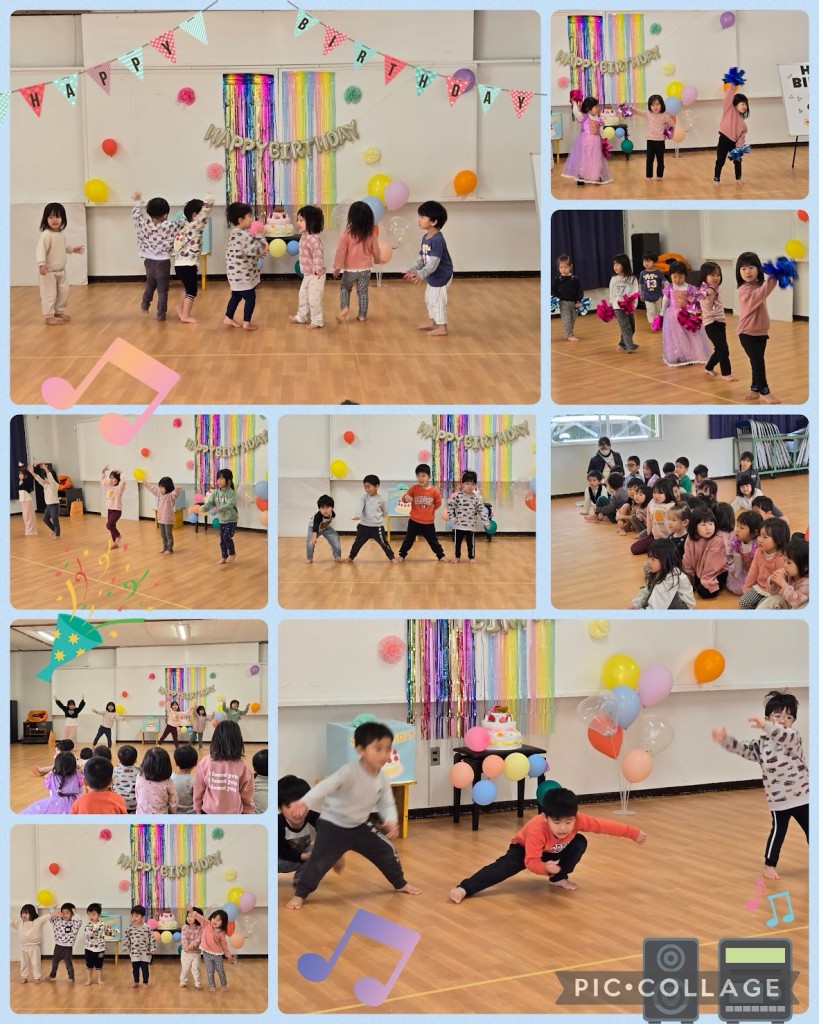 Posted on 2026年2月10日 by test 1月のお誕生会の様子です。 まずは自己紹介から みんな元気よく質問に答えてくれました☺️ ろうそく消しです。 力強く息を吹きかけ、ろうそくの火を上手に消すことができました😊 写真撮影 みんな笑顔で「ハイチーズ」 素敵な写真を撮ることができました📷 最後はクラスのお友達が、様々なお遊戯を披露してくれ、 ホールは大盛り上がり♫ 楽しいお誕生会でした😊